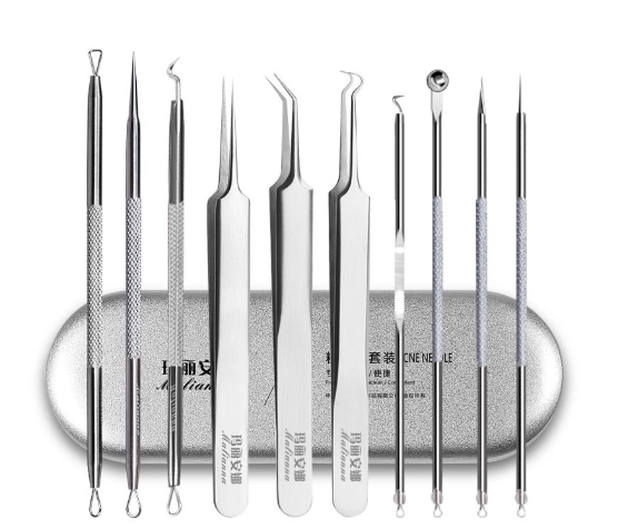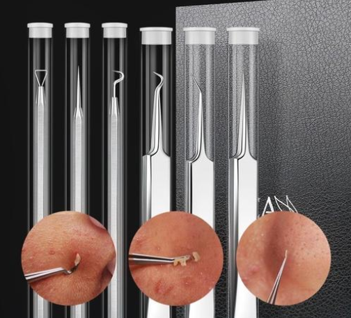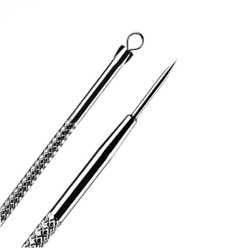 2. 使用时候,先用带尖尖针头一端轻轻挑破痘痘、粉刺,这样才能将皮下部分纤维组织挑破。
