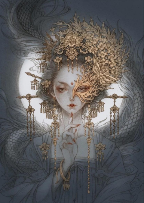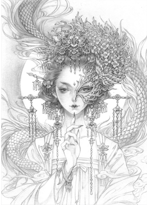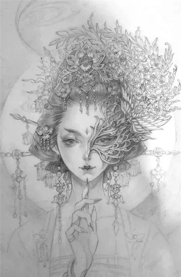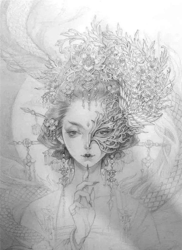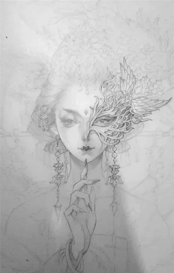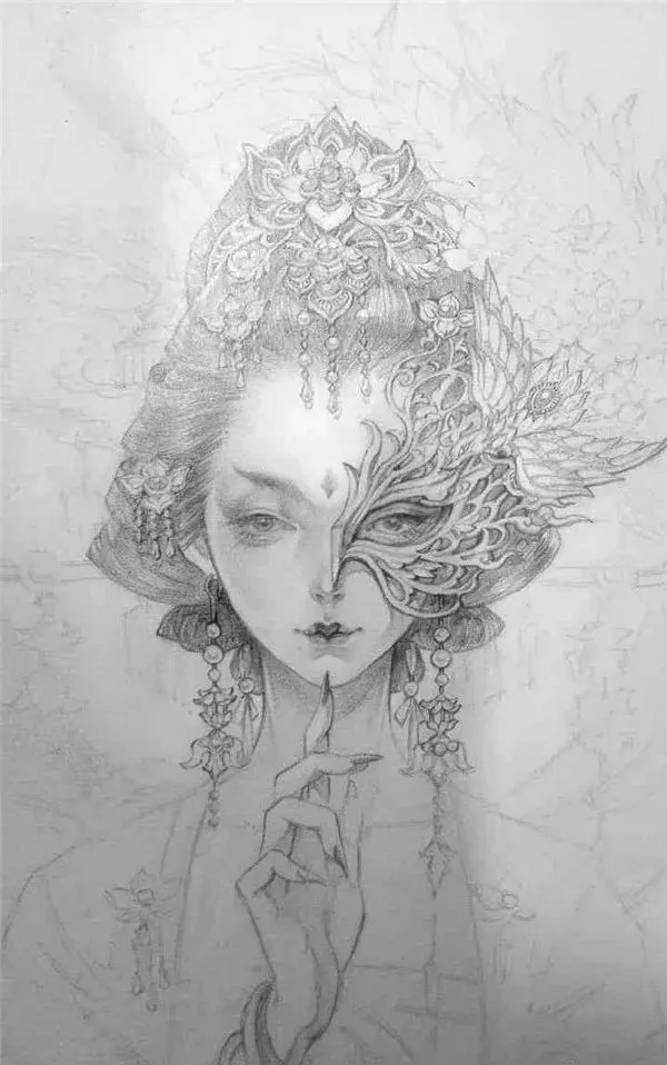古戈力的《半面妆》手绘步骤,首先要画人物底稿,在画人物轮廓,刻画人物的细节部分,以及人物的发型,再者开始刻画人物发饰,这一点普通人很难画。背景部分的刻画,着重刻画细节,最后人物上色、背景和服饰上色,这样就完成了。