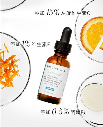 修丽可CE精华顾名思义,主要成分就是维生素C和维生素E,结合我前面说的黄金组合。修丽可CE精华是“15%维生素C-1%维生素E-0.5%阿魏酸”的组合!杜克大学的研究表明,维生素E和阿魏酸的加入,可以有效防止维生素C在产品存放/使用过程中的氧化,从而保证其在保质期内具有足够强的抗氧化能力。而且,在15%的维生素C和1%的维生素E中加入0.5%阿魏酸可以产生协同效应,把这个组合的抗氧化能力提高到8倍。