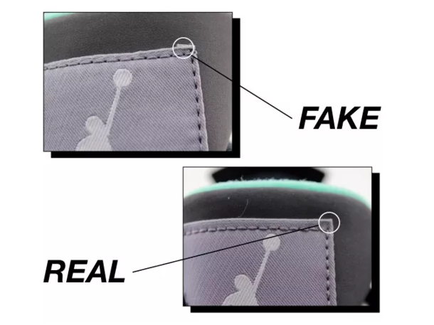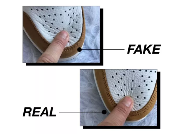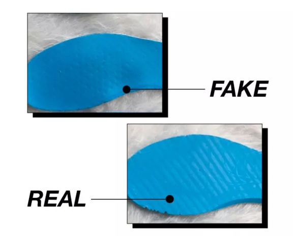 上假:假鞋部分有多余的折叠部分,并且钻线孔并没有正品那么细;