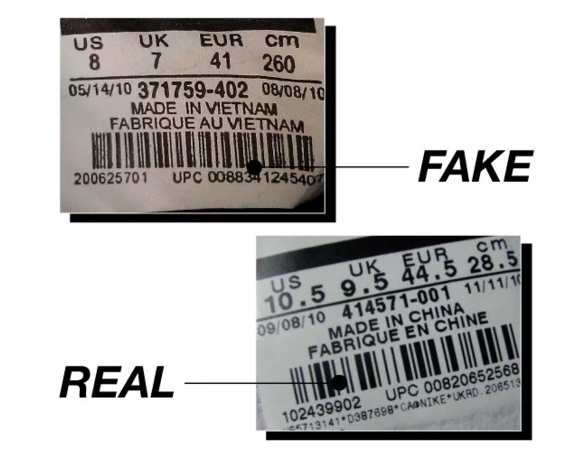 上假:假标条形码有好几种粗细线条;尺码栏部分的US、UK、EUR、cm的字母间距也不相等;UPC码一行的字母、数字间距不相等;字体看起来模糊