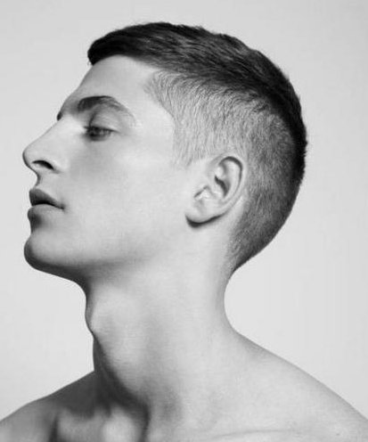 典型的莫西干发型,在这个角度来看发型梳向中间非常的明显,再配上这长方脸男人味确实十足,再搭配上一款带扣底衫,墨绿色的,果然有男人味。