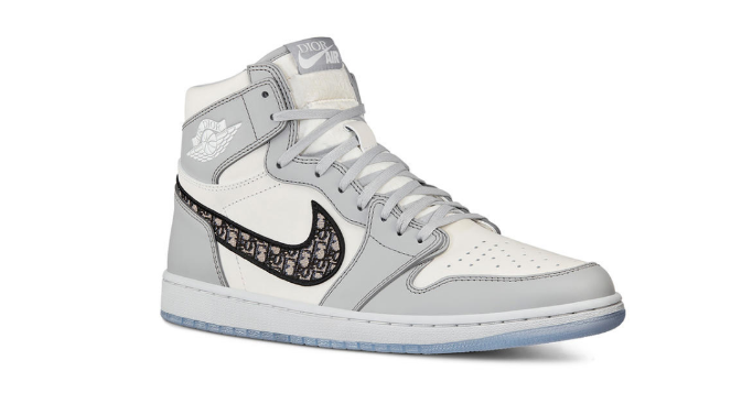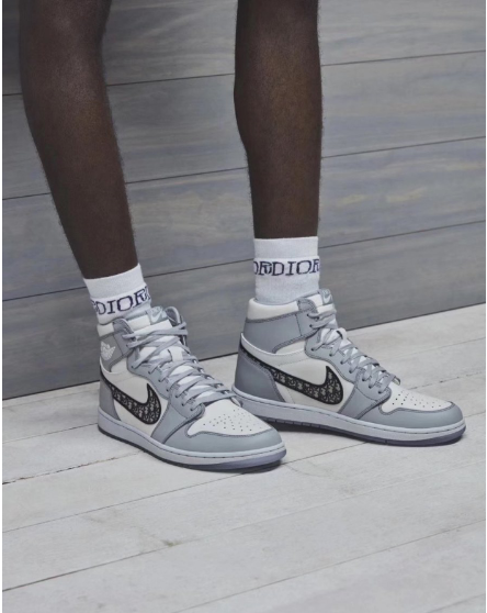 鞋款采用意大利最高制造技术,以精选小牛皮制成,代表了 Maison Dior的皮具生产造诣。鞋身由乳白色和迪奥灰( Dior Gray)拼接组成,自1947年成立以来,颜色一直是Maison dior的代名词。标志性的混合鞋帮上印有 Jumpman Wings徽标,并标有"AIR DIOR"字样,同时配有一个 Jumpman吊坠。 Nike swoosh以及鞋舌采用 Dior oblique提花制成,单个图案同时代表着两个行业的领导者;水晶大底上分别印有Dior字样以及Jumpman Wings徽标以彰显球鞋的身份。
