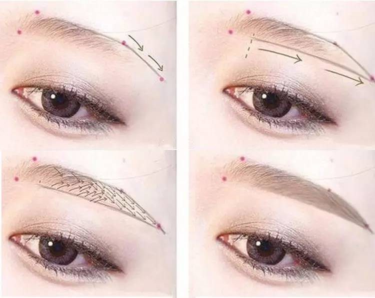 第一步:比拟桃花眉,拱形眉的弧度崎岖比拟大,眉尾最低点和眉头的下三分之一在一条线上,别的为了添加角度感,用眉笔顺着箭头标的目的画到眉头。