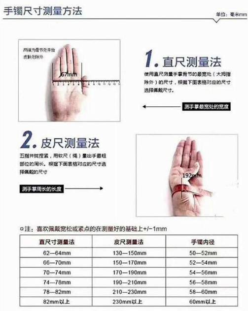 使用直尺(软尺)量手掌宽处(大拇指除外)的宽度,测量出的尺码按照以下相应数据,选择合适内径尺寸的手镯。