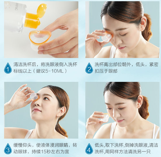 清洁洗杯后,将洗眼液倒入洗杯标线以上(建议5-1OML),洗杯高出部位朝外,低头,紧密扣压于眼部。