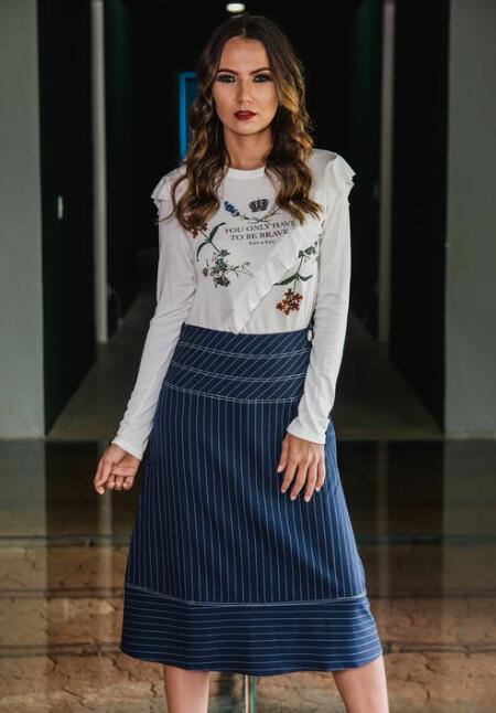 10. 色百褶长裙搭配黑白条纹T恤,配上腰带,勾勒腰身,特别显瘦,有种欧美风格。