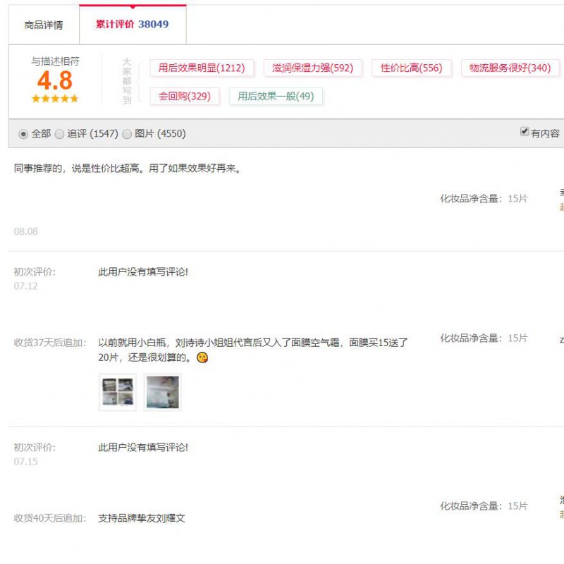 在OLAY的几个电商平台旗舰店,用户对olay面膜产品的评价大部分都是效果明显、滋润保湿力强、好吸收、性价比高等。只有极少部分的用户觉得效果一般。由此来看,该产品还算是比较不错的,当然不同的肤质及使用方法不同,最终的使用效果也是不尽相同的。