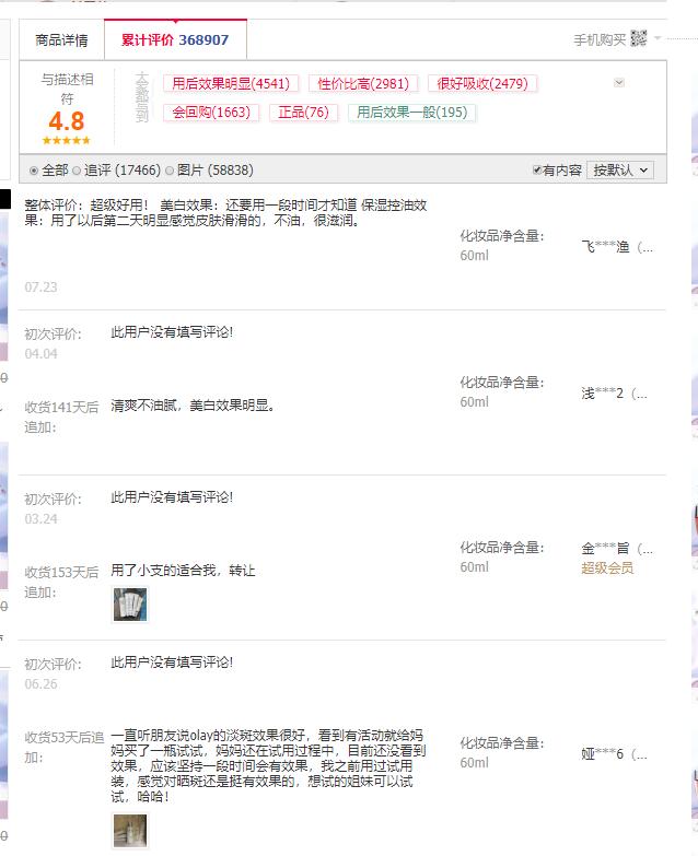 在OLAY的几个电商平台旗舰店,用户对olay淡斑小白瓶的评价觉得效果好的在约36.5万条评论中,占了98%以上,觉得效果一般的只不到1%,由此来看,该产品还算是比较不错的,当然不同的肤质及使用方法不同,最终的使用效果也是不尽相同的。