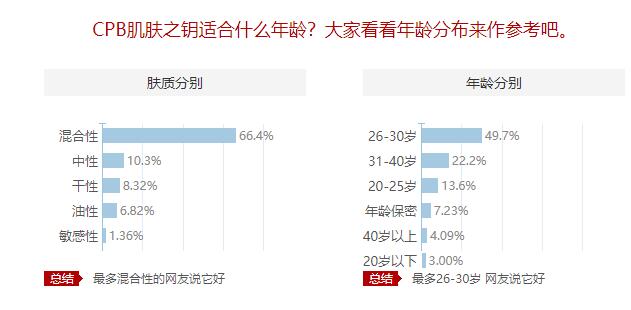 虽然产品最初定位的消费人群年龄大至在30-40岁之间,后随着知名度的提升,越来越多的年轻女性也加入到CPB的消费行列。由数据可见,使用CPB肌肤之钥产品的人群在23到30岁居多,CPB肌肤之钥适合什么年龄,具体还是要根个人的肤质,经济条件来选择最合适自己的产品。