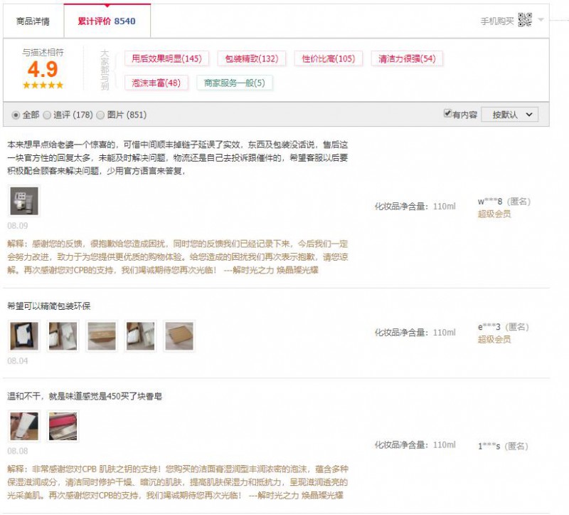 在肌肤之钥的几个电商平台旗舰店的几万评论中,反馈效果明显的用户占了绝大多数,只有约百分之一左右的用户觉得效果一般,由此来看,CPB的洁面乳还算是比较不错的,具体还是要根个人的肤质,经济条件来选择最合适自己的产品。