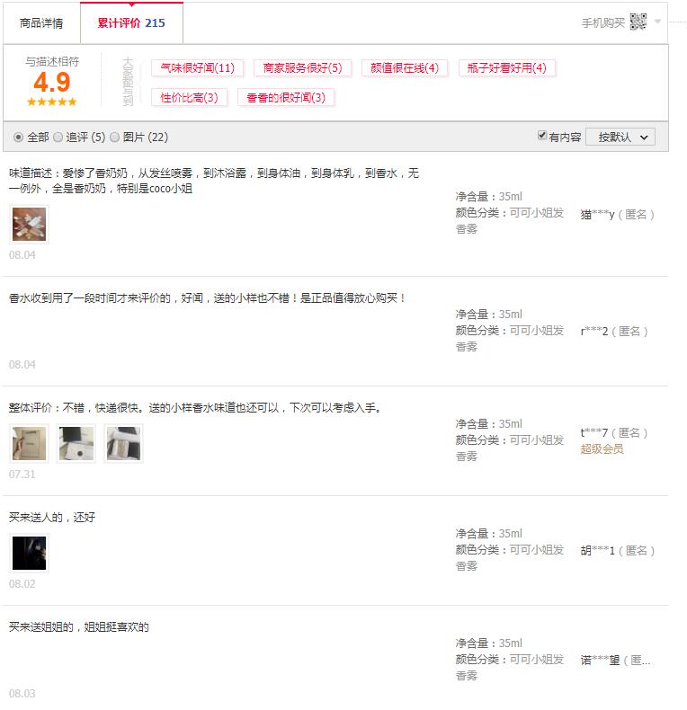 在CHANEL的在几个头部电商平台销量较高的旗舰店内,用户对于可可小姐发香雾评价都比较不错,大部分买家都觉得可可小姐发香雾气味好闻、商家服务很好、颜值很在线、瓶子好看好用、性价比高。当然也要根据自己的肤质,经济实力等选择适合自己的产品才是最好的。