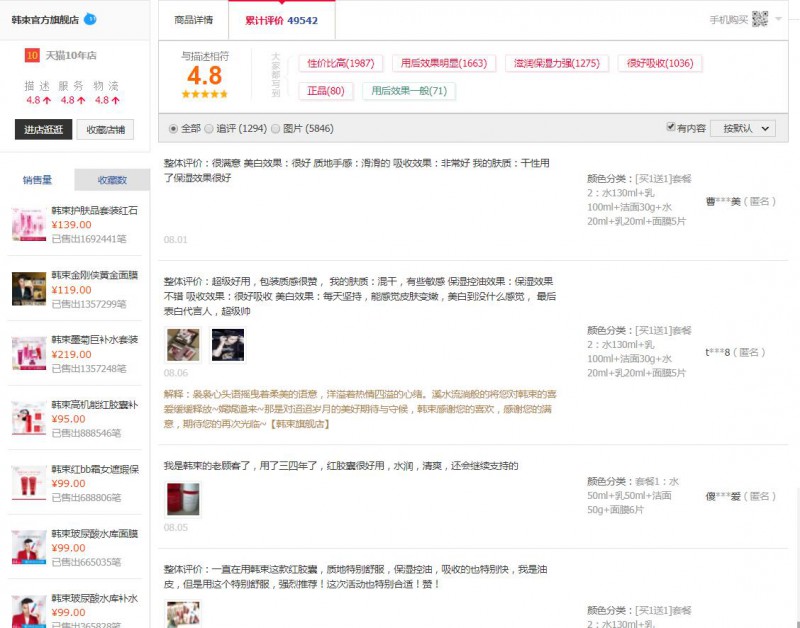 韩束红胶囊水在天猫官方旗舰店的用户评价还是不错的,5万条评价,只有不到100条是负面评价,所以该产品效果应该还是比较好的。