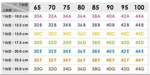 假设一位女性,胸围85cm,下胸围70cm,那么罩杯尺寸就是85cm-70cm=15cm。罩杯一般用a、b、c等大写英文字母表示,每2.5cm为一级,aa最小为7.5cm,a为10cm,b是12.5cm,c是15cm,d是17.5cm,e是20cm,再往上就算是特种尺寸了(详见尺码对照表)。像上例说的那位女性,胸围85cm,下胸围70cm,罩杯尺寸为15cm,就是c。于是,她适合穿的胸罩型号就为70c。只要是符合国际胸罩标识标准的产品,都是用这样的方法来区分型号的。