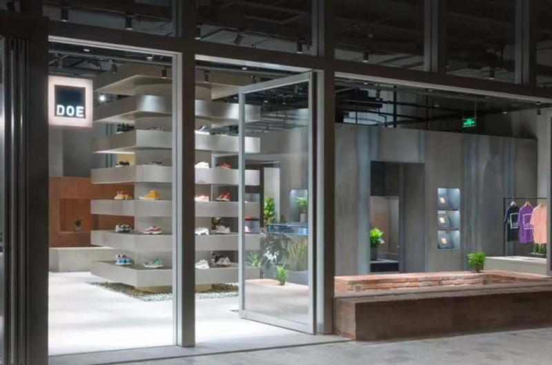 其中新的店铺空间设计从 DOE 品牌文化中的“Street Culture”出发,引入街道与城市的概念,打破室内外的边界,将室内空间开放给城市,也将城市景观引入室内。