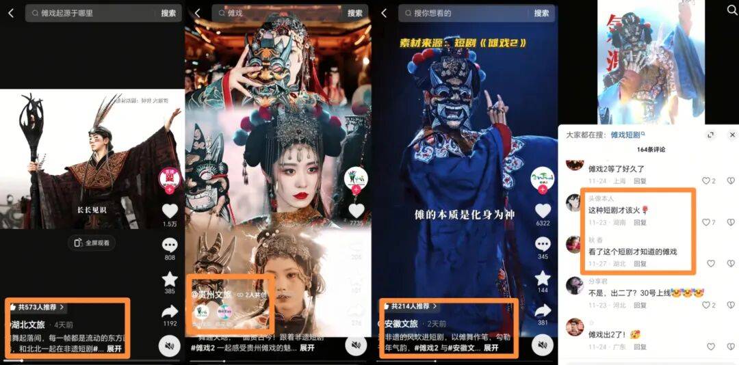 剧集上线后,贵州文旅、安徽文旅、湖北文旅等傩戏传承地的抖音官方账号纷纷引用剧中情节与真实傩戏影像混剪,也收获了大批微短剧观众。