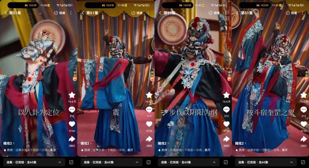 其三,借助技术创新表达形式。在视听语言上,非遗中的诸多仪式、符号往往带有抽象或难以具象化的特点,微短剧则可以借助AI或特效技术,将传统文化中难以实现的想象进行重新表达和呈现。例如利用特效,将傩戏中的“八卦步”“天地乾坤”等文化符号进行可视化呈现,让传统仪式的神秘感与美感更符合当代观众的审美。