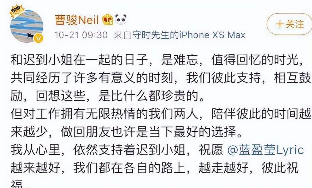 2019年,蓝盈莹因《乘风破浪的姐姐》迎来事业高峰,不久后,两人发文官宣和平分手,退回朋友位置。分手后彼此依旧体面,蓝盈莹多次在公开场合表达对曹骏的欣赏与支持,甚至直言“始终相信他的未来会比我好很多”。