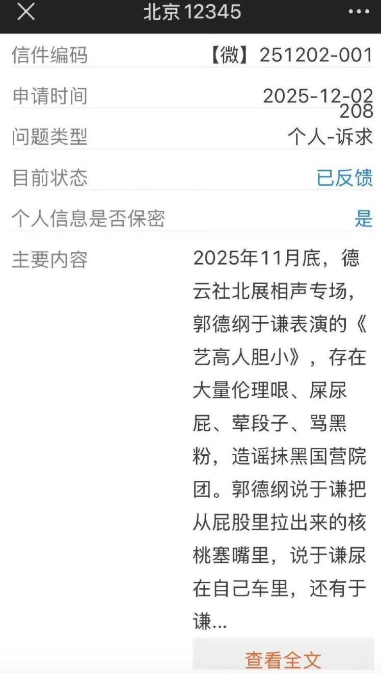 可以看到,举报者举报郭德纲的理由,是玩伦理哏、说屎尿屁、荤段子、骂黑粉,造谣抹黑国营院团,还说于谦把从屁股里拉出来的核桃塞嘴里,还说于谦尿在自己车里,等等……