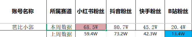 该博主是属于生活类自媒体,各种模仿,挑战,搞笑都用,该博主的矩阵意识还是可以的,主流的短视频平台都在运营,但是目前应该B站的粉丝是最少的,她应该是抖音和小红书发家的,是位女生,大家如果想做生活类的博主,可以去参考这位博主。上周她上了B站的涨粉榜,本周上了小红书的涨粉榜。