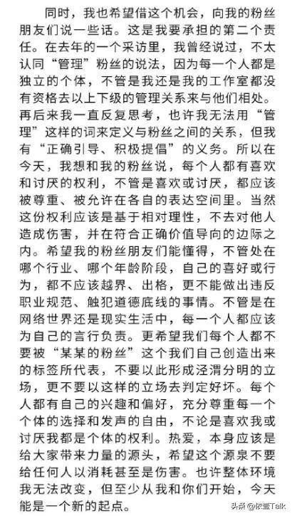 他选择沉下心来反思,之后通过微博公开发声:“或许‘管理’一词,并不适用于我与粉丝之间的关系,但我始终肩负着正确引导、积极提倡的义务。”