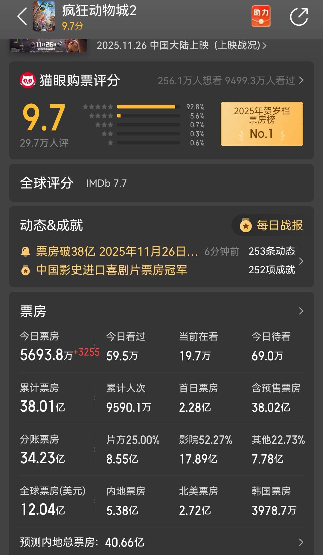 《疯狂动物城2》中国票房破38亿 全球票房累计过12亿美元(疯狂动物城2观后感)