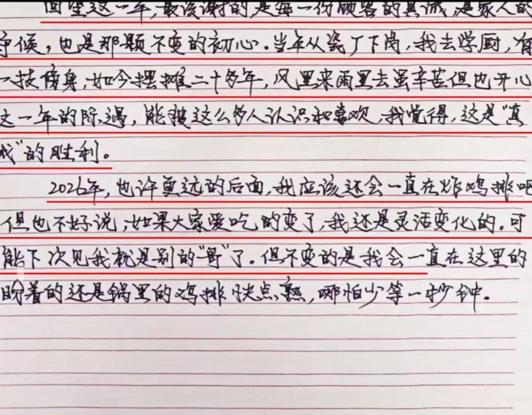 “2026年,也许更远的后面,我应该还会一直在炸鸡排吧,但也不好说。如果大家爱吃的变了,我还是会灵活变化的。可能下次见我,就是别的‘哥’了。但不变的是,我会一直在这里的,盼着的还是锅里的鸡排快点熟,哪怕少等一秒钟。”