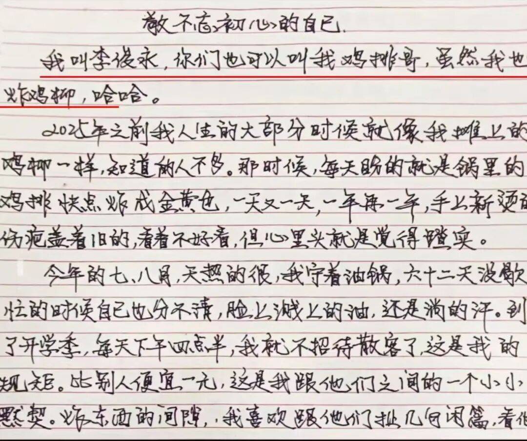 在这里,“鸡排哥”也用一篇作文——《敬不忘初心的自己》回顾了自己的走红经历。