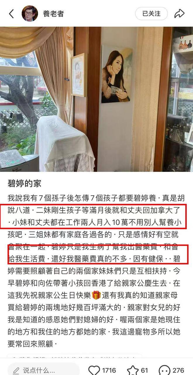 郭碧婷和向佐最近去了香港为向华强庆祝生日,而郭碧婷的父亲则独自在家。看到网上有些不实的消息,他特意晒出了照片来回应。有人说郭碧婷的两位妹妹颜值不如她,对此郭碧婷的爸爸表示不认同,便公开分享了两个妹妹的照片,予以澄清。照片显示,郭碧婷的三个妹妹都是混血,郭爸爸还解释道,左边是小妹,右边是二妹,二妹与郭碧婷相似。目前二妹正在湾湾坐月子,她的丈夫在加拿大工作,生完孩子后将返回加拿大生活。二妹有两个女儿,大女儿名叫妮妮。小女儿则育有三个儿子。这样算下来,郭碧婷加上自己的两个孩子,郭爸爸一共有七个孙子孙女(当然也有外孙外孙女之称,实际没有太大区别)。