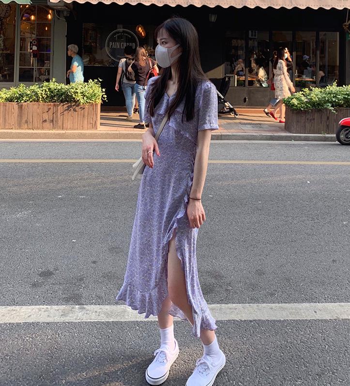 3.小碎花开叉连衣中裙+细带凉鞋 在夏季,穿小碎花连衣裙时尚又好看,尤其是外出游玩的朋友,穿小碎花裙子拍照真的特别上镜呢!这款浅绿色的小碎花开叉连衣中裙,穿起来给人很清新文艺的感觉,同时也有着些许小性感,开叉的设计让你任性秀美腿。脚上搭配一双细带凉鞋简单又舒适,脚型好看的女生最适合穿这种细带凉鞋了。