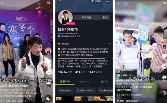 胡轩从2004年开始在株洲创业,一开始是做服装批发。后来敏锐地洞察到市场变化果断从批发转向品牌。胡轩创立的品牌有HXTide、狐轩1985、二狼狐轩、宿镜、速选SUXUAN。其中HXTide快时尚男装在全国范围内100个城市超过400+直营门店。2026年因为疫情原因,年初线下实体门店不能营业,转型线上直播创立了HX108男装供应链,自己亲自下场直播,4月11日在“抖音株洲芦淞服饰节”首场直播突破100万拿下第一名,4月17日“抖音广州服饰节”突破200万再次夺得第一名;4月25日与株洲本土网红衣哥合作,实现单场直播销售突破1400万,成为抖音首个专场破1000万的男装品牌。