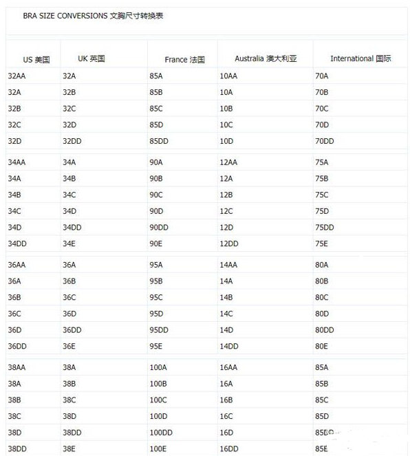 大家可以参考维密官方给出的文胸尺码对照表来进行选择~