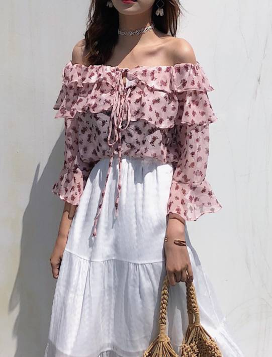 雪纺微透的小碎花上衣,更是给整身LOOK注入了些许性感的小女人味道,荷叶边的设计甜美又浪漫。