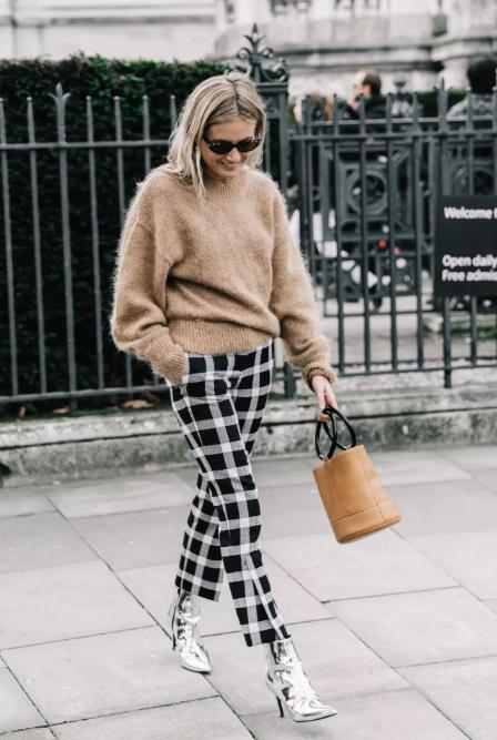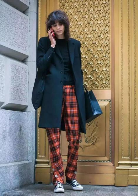 咖啡色的格子裤子是出镜率最高的,而配上今年的踩脚设计,更是英伦风带有时髦,瞬间脱离路人形象,并且浅咖啡色搭配浅蓝色这一对比色组合,巧妙的吸引眼球!格纹搭配格纹是非常难以驾驭的,但是只要穿好了,你绝对是最抢眼的那一个,全身同色同元素却又稍许有差异的衬衫搭配裤子,非常具有层次感,并且最能体现你的搭配功底和技巧哦。
