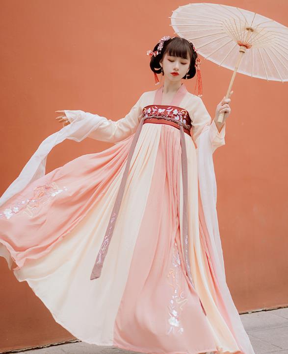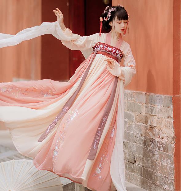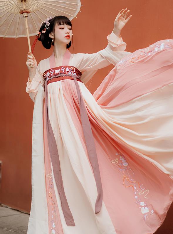 齐胸襦裙是对南北朝特有的一种女子襦裙装的称呼,根据裙头的位置而得名,与高腰襦裙相区分,高腰襦裙系于胸部以下腰部以上,齐腰襦裙系于腰间,齐胸襦裙系于腋下。齐胸襦裙最早见于南北朝,经历了隋、唐、五代直到宋朝理学兴起才被历史淘汰,大约有1000年的历史。唐代之前出土的陶俑,或绘画,多见有背带的款式,发展到唐代开元年间变为用系带在腋下固定。