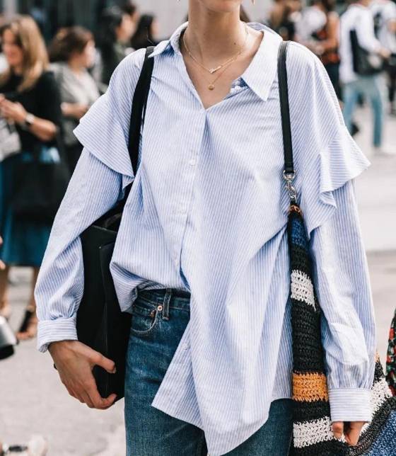 穿这种衬衫时,我们可以选择纽扣不扣上,然后将两侧的下摆在胸前打结,如上图所示,会非常的时尚而且潮流,裤子建议选择阔腿裤或者牛仔裤,气质就会很潮、元气也很满。