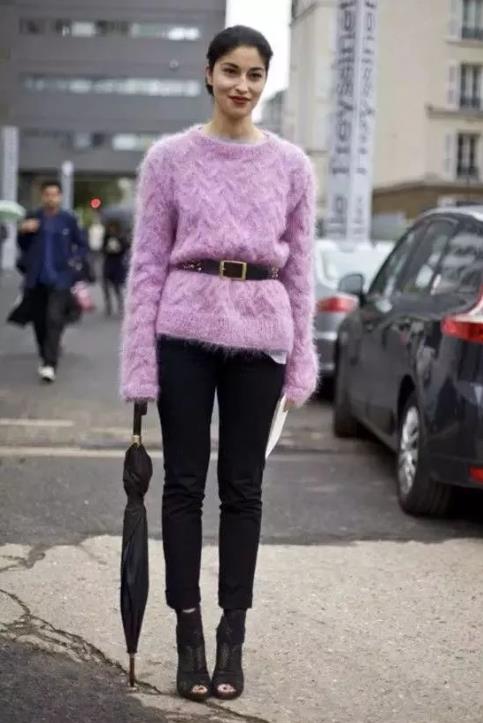 3. 黑色皮衣:有时候紫色难免会给人一种张扬不靠谱的感觉,于是在这种时候就需要用相对肃静一些的黑色来进行矫正,特别是皮衣材质会给人一种酷酷的感觉,两者进行搭配就会很巧妙的化解两边带来的特有感觉,达到和谐的视觉效果,各位小仙女们都是可以试一试的。