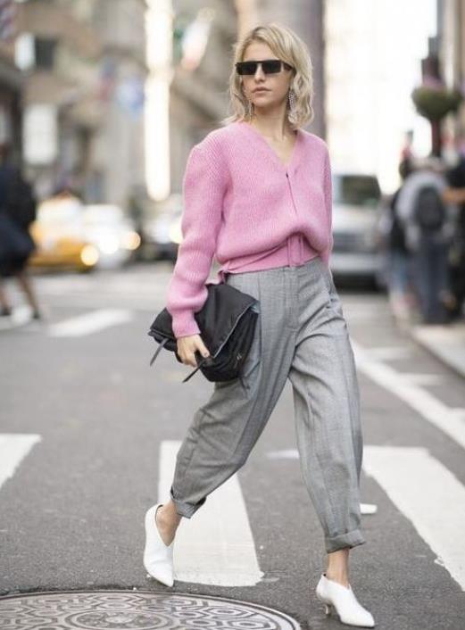 粉色和灰色是搭配非常和谐的基友色。上身粉色下身灰色,既柔和又美好。选择帅气款的包包,增加整个搭配的魅力指数。