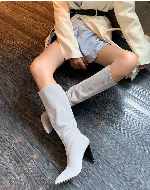 搭配LOOK.7灰色粗跟尖头短筒靴