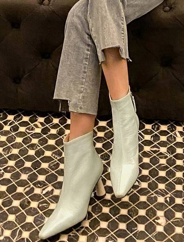 灰色的短靴,在一定程度上也许没有黑色的百搭,但是只要在穿搭上下点功夫,也可以穿得很chic,充满欧美风的一款马丁短靴,尖头+细高跟,这样的鞋款穿在脚上特别有气质,显性感,绒面材质,里面还进行了加绒,寒冷的冬季穿也很保暖。