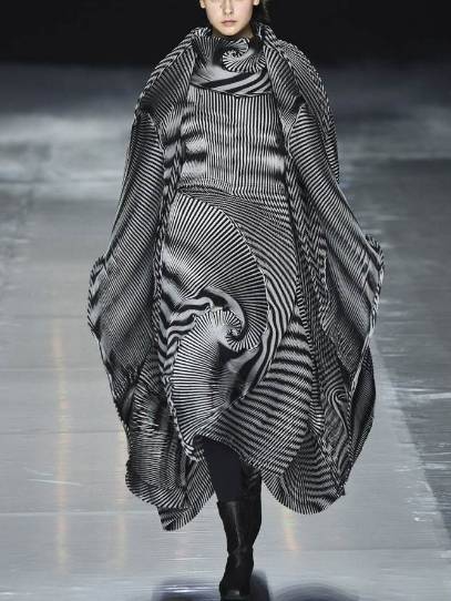 褶皱是日本品牌三宅一生的特色,前几年日本的三宅一生让褶皱服装着实火了一把,早在20世纪初欧洲也流行过褶皱服装,主要是利用压褶机将布料压出规则或者不规则的褶皱,再进行剪裁制成服装。