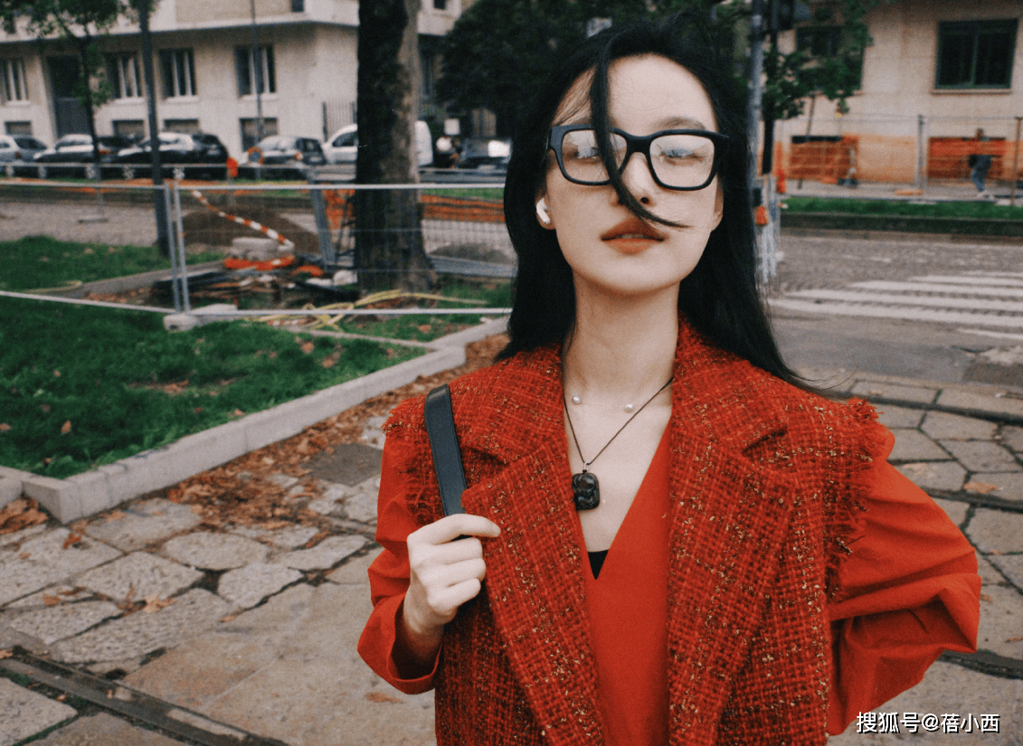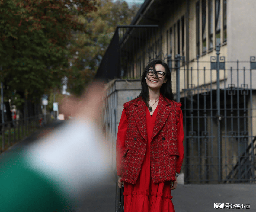 马甲里层搭了一件连衣裙,裙子是V型领口,分分钟衬出天鹅颈;连衣裙颜色为大红色,瞬间吸引众人目光。红裙是长袖设计,可以有效保护双臂,再加上袖子面料与手臂留有一定空间,所以遮肉肉不在话下。连衣裙整体版型宽松,在户外行走时,一阵风吹来,裙摆会飘起来,随之产生一种意境美,让人忍不住想驻足多看几眼。
