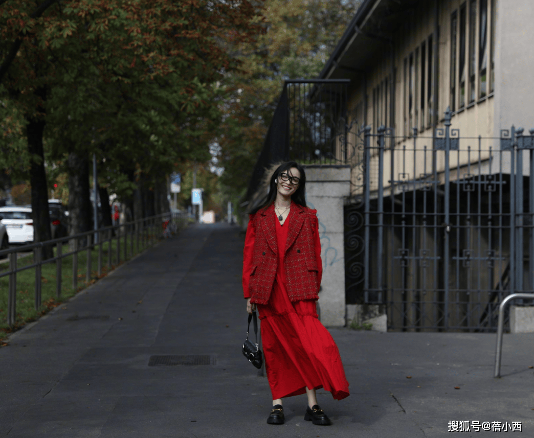 红色连衣裙的裙摆遮住了脚踝,老实说,这种长度不太适合小个子女生,裙长在膝盖上下最为合适了。脚上是一双黑色乐福鞋,鞋底带些厚度,只要鞋底柔软,那么走路就会很舒服。