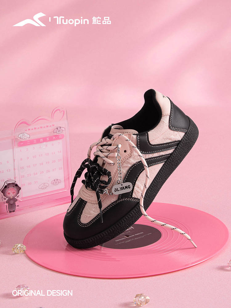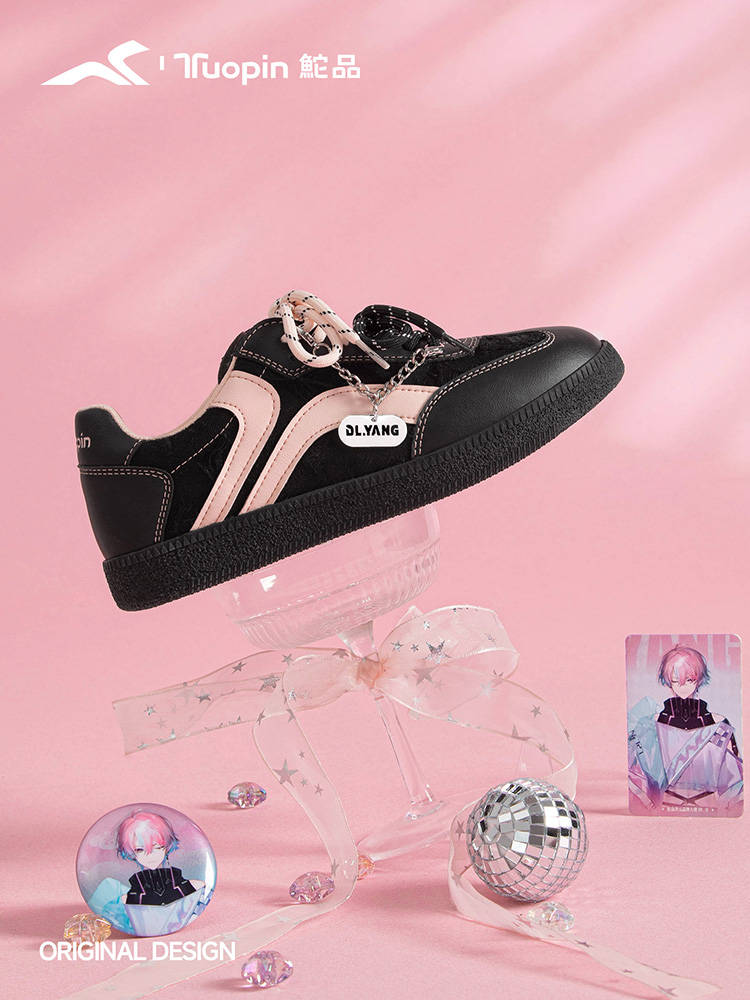 此次合作,以“曜见破晓,循息踏光”为主概念,从DL.羊的整体形象中汲取核心灵感,“粉昼”与“黑曜”两款联名德训鞋由此诞生。两款德训鞋在设计上紧扣DL.羊主体形象的视觉特征,粉黑主色调巧妙呼应其虚拟形象;细节处更见心意:除了主体配色之外,鮀品还特别为该鞋款设计了可拆卸的银色五角星链条与精心雕刻的DL.羊专属铭牌,将虚拟角色的个性符号融入现实时尚。
