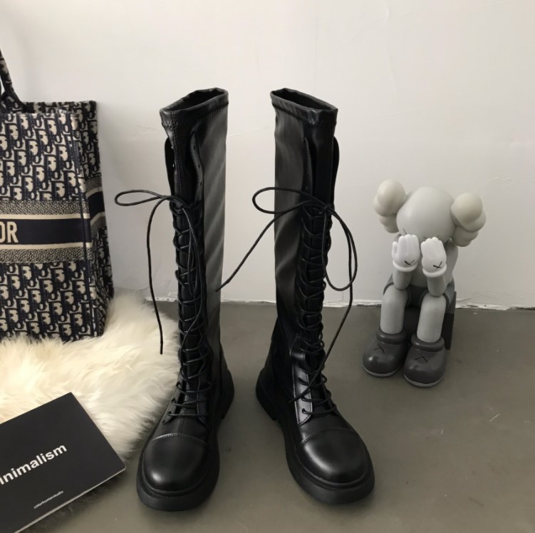 黑色长靴应该是平时最常穿的,也是最主流、最经典的单品,搭配一条黑色皮短裙,上身搭配一件白色针织衫,高挑又很显身材。