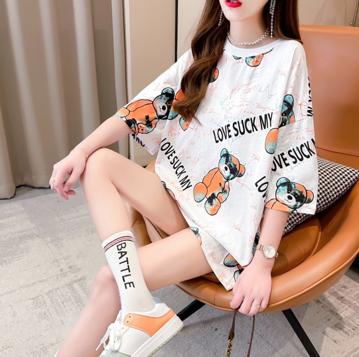 长款t恤我们可以在下面穿一个那种超短裤,其实就是那种下装失踪的穿法, 不过这个关键的一点就是你的腿不能够太粗不然就很不好看了,或者长款t恤搭配宽松的牛仔裤也是可以的,这样可爱又减龄。