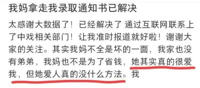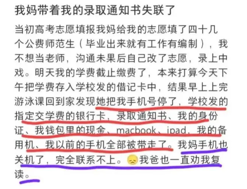 这位女孩是今年的高考生,填报志愿时,她的母亲希望她选择公费师范学校,以获得“铁饭碗”的工作。然而,女孩有自己的梦想,希望进入中戏。虽然她最终被中戏录取,但她的母亲不同意,并在女孩不在家时将她的手机、身份证、现金以及录取通知书全部带走,甚至报停了她的手机号码。