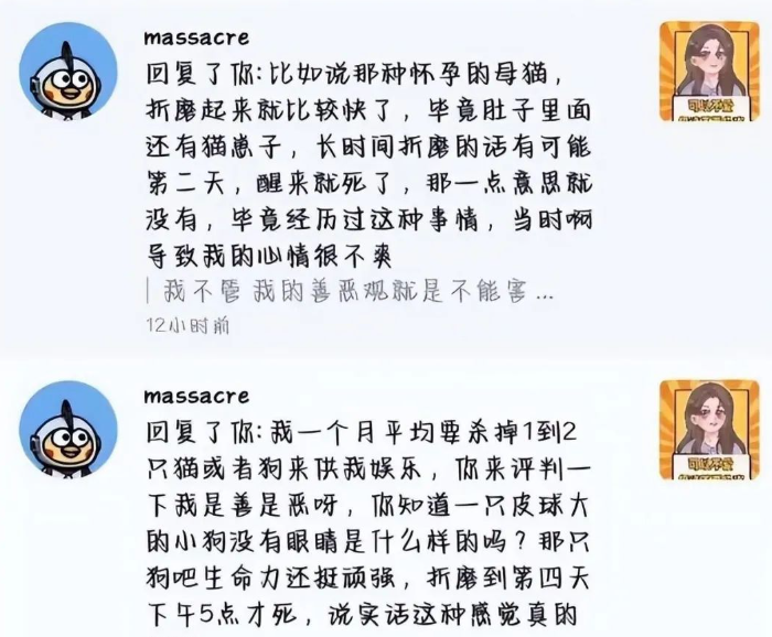 这一家人的行为已经到了丧心病狂的地步,甚至在他们的价值观中,虐待动物竟然成为了一种“缓解”这名高中生躁郁症的方式。“小孩子家家的就是闹着玩,没必要上纲上线。”“他还小,懂什么啊!长大后就不会这样了”“虐动物又不是虐人,芝麻大点事,难不成还给打一顿。”这起事件引发了许多思考。虽然我们普遍将虐待宠物归咎于施虐者个人的消极特质,如反社会人格等,但其背后的动机却是如此复杂。我们必须认识到,虐待动物不仅仅是单纯的恶行,更是人内心复杂需求的一种表现。从外部动机虐待到内部动机虐待,背后隐藏着个人心理、社会环境等多种因素的影响。根据行为主义的条件化理论,人们倾向于在获得奖励的情况下重复他们的行为。因此,这种最初偶然的虐待行为可能会被条件化,使个体学会了“虐待”这一行为,并将其与获得快感或奖励联系起来。随着时间的推移,这种条件化的虐待行为可能会逐渐加强,因为个体认为这是一种获得满足感的途径。他们可能会越来越频繁地对宠物施虐,因为他们从中获得了情感上的满足,甚至可能会将其视为一种习惯或发泄的方式。
