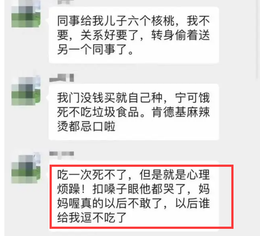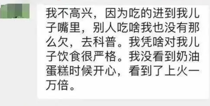 帖子里的对话中,疑似这位当事人妈妈称,自己对儿子的饮食十分讲究,只给儿子偶尔吃动物奶油蛋糕,而且几乎不碰反式脂肪的食物。而且,这种情况已经不是第一次出现了,她近乎病态的控制着孩子的饮食,肯德基麻辣烫六个核桃都被其视为“毒品”,“宁可饿死”也不让孩子吃。这位宝妈言语间情绪激动,因为“人体代谢反式脂肪酸的奶油需要五十多天”,甚至考虑催吐补救。