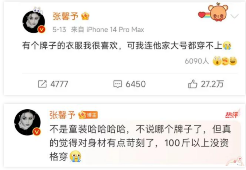 你是否因买不到合适衣服而责怪自己太胖?是否也对“漫画A4腰”、“反手摸肚脐”、“锁骨放硬币”充满羡慕?前几天张馨予发了条微博,很爆。她吐槽一个衣服品牌,说自己很喜欢那个牌子的衣服,但是连他家大号都穿不上。